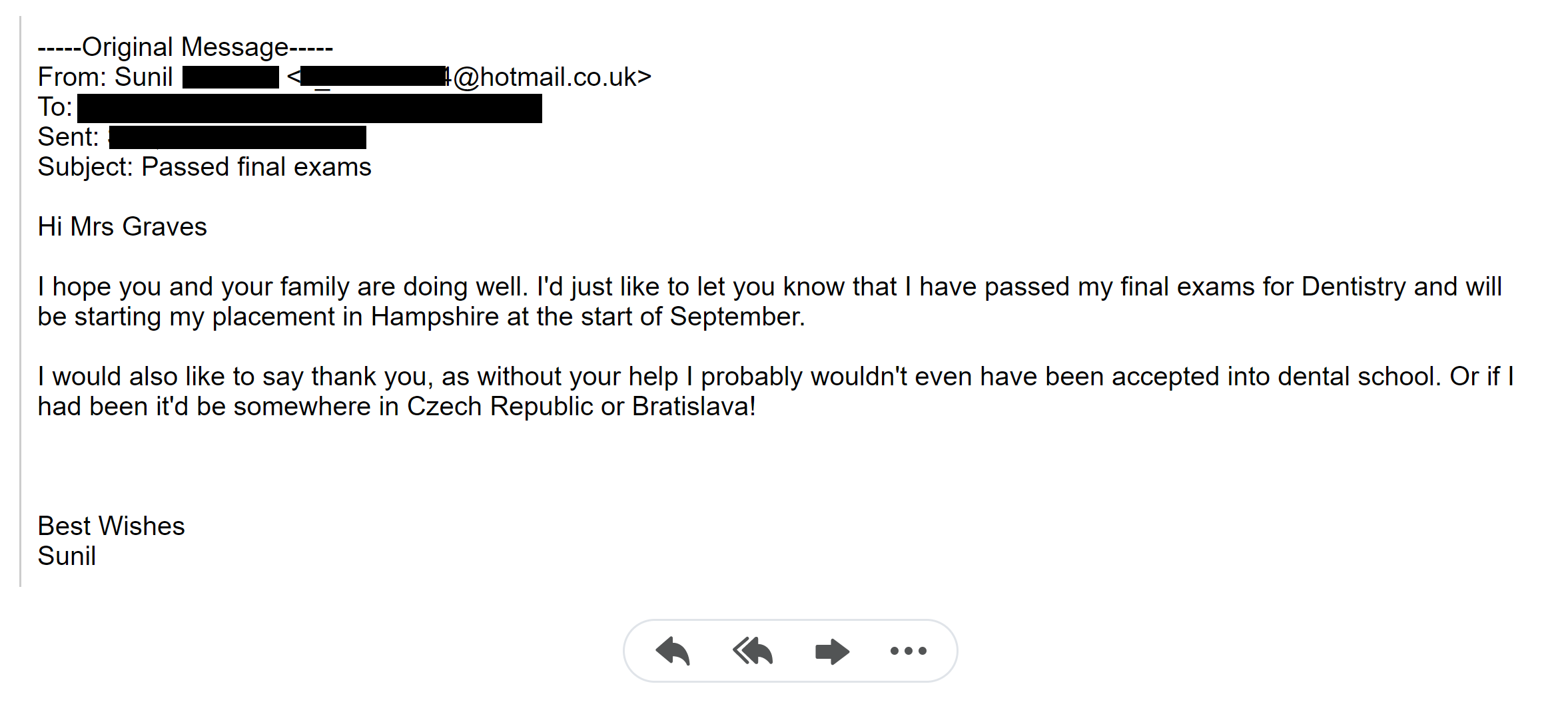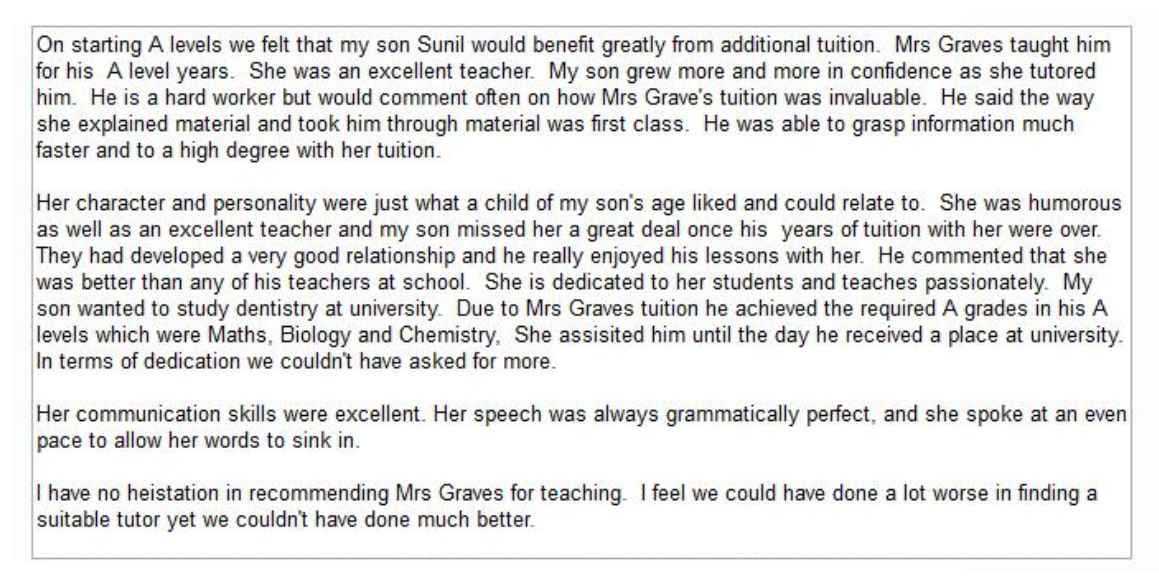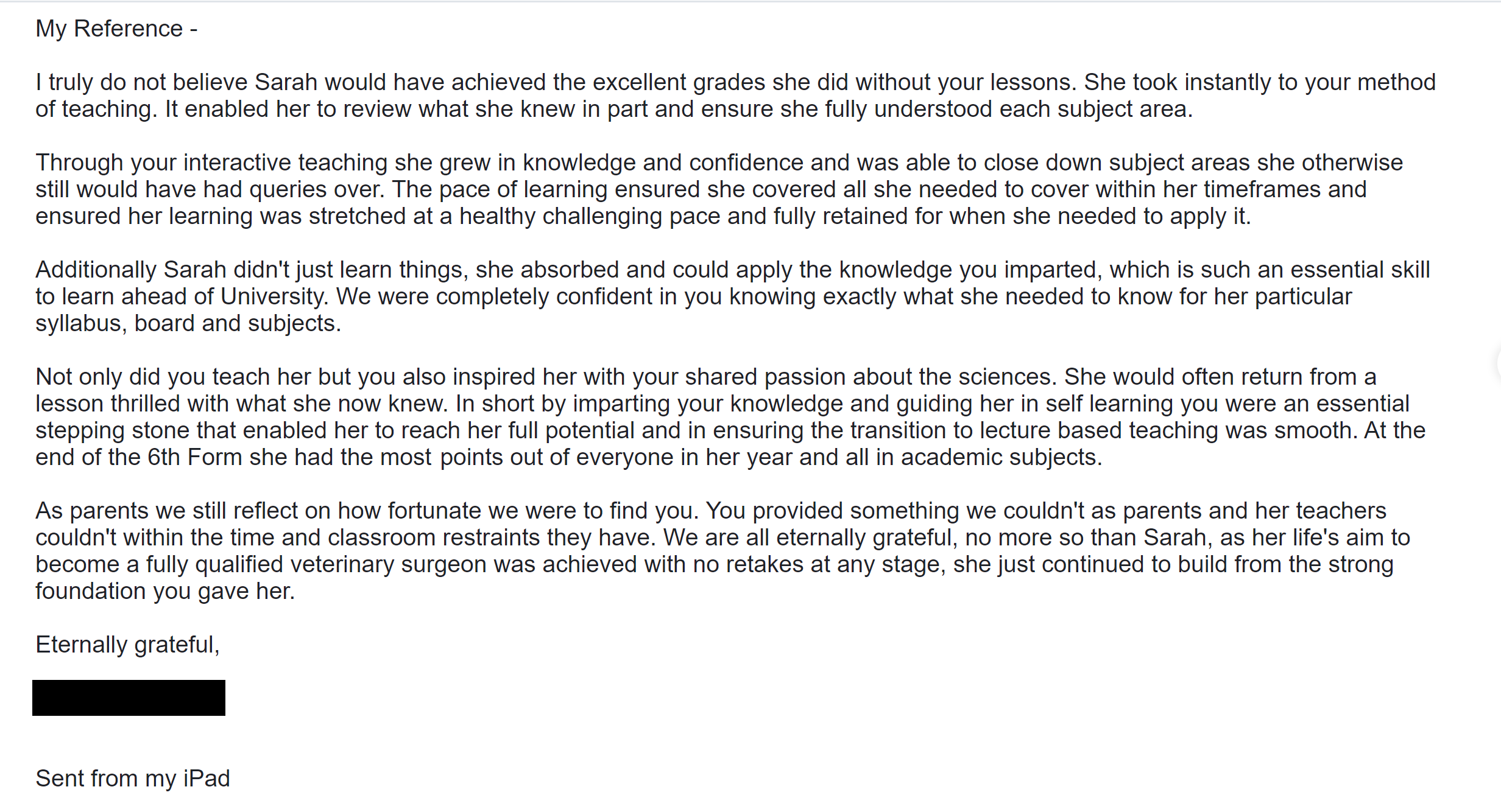 Our students are doing exceptionally well. It may be tempting to send your child to a large group revision course, but no matter how well-know the institution and how big the name, it amounts to not very much if it does not alter the direction of the child's life. One-to-one tuition does just that. We know we changed some lives. Sofiya was previously working at D's and E's. Part of her problem was that she was a non-native English speaker and her studies had left her confused. With a lot of work on our part, she achieved A*A*A for A-level and is doing Medicine at a top University. Another student has a very low AAB offer this year from a top Univeristy for Medicine despite being told a the start of the year that he should give up chemistry he is on track for A*A*A*. We have high-level people to take students through the interview process and prepare them and we left nothing to chance. There are others who have already graduated from university. Here is one example.